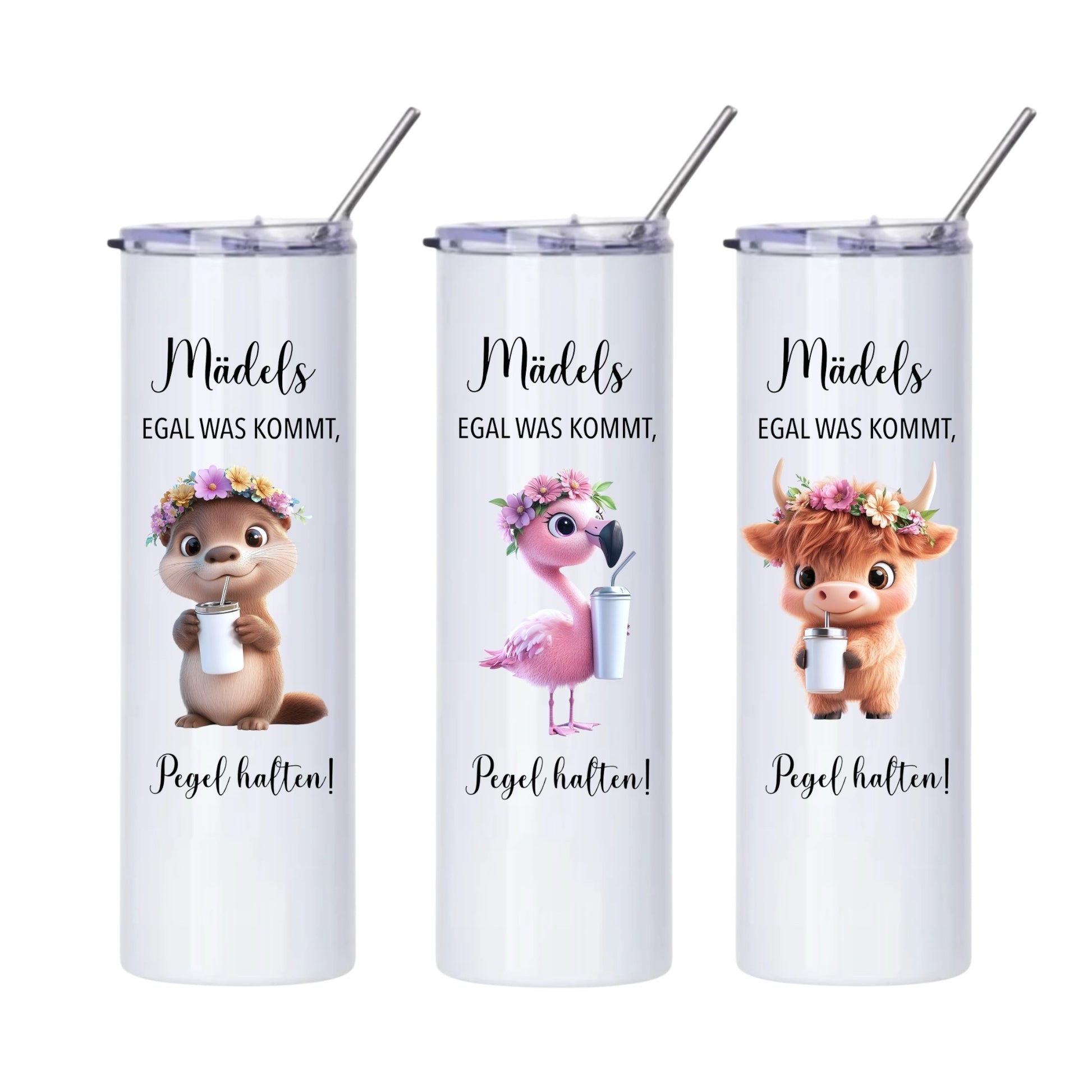 Thermobecher "Mädels Pegel halten", 590ml, Weiß, mit Edelstahlstrohhalm,Flamingo, Otter etc.