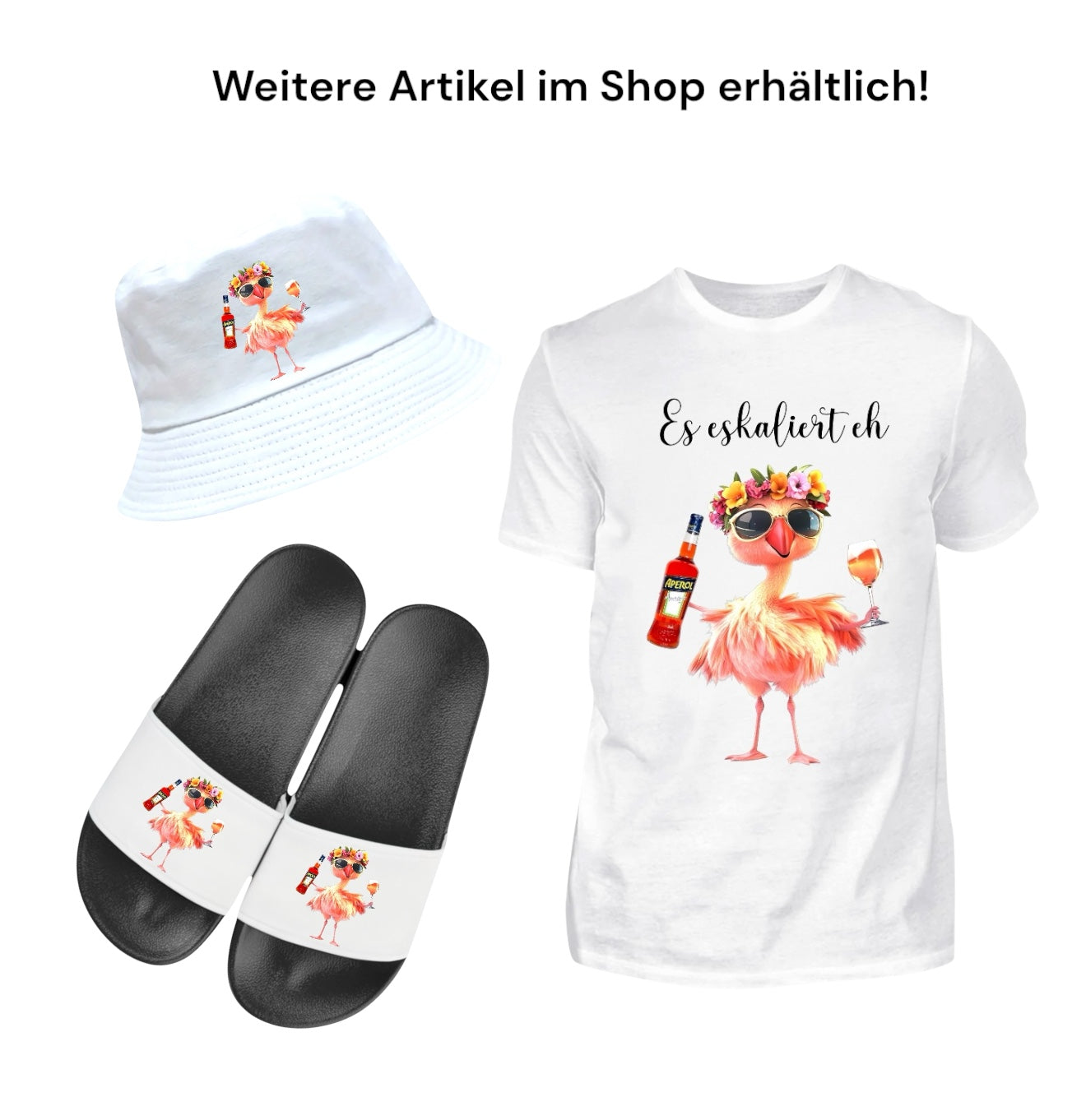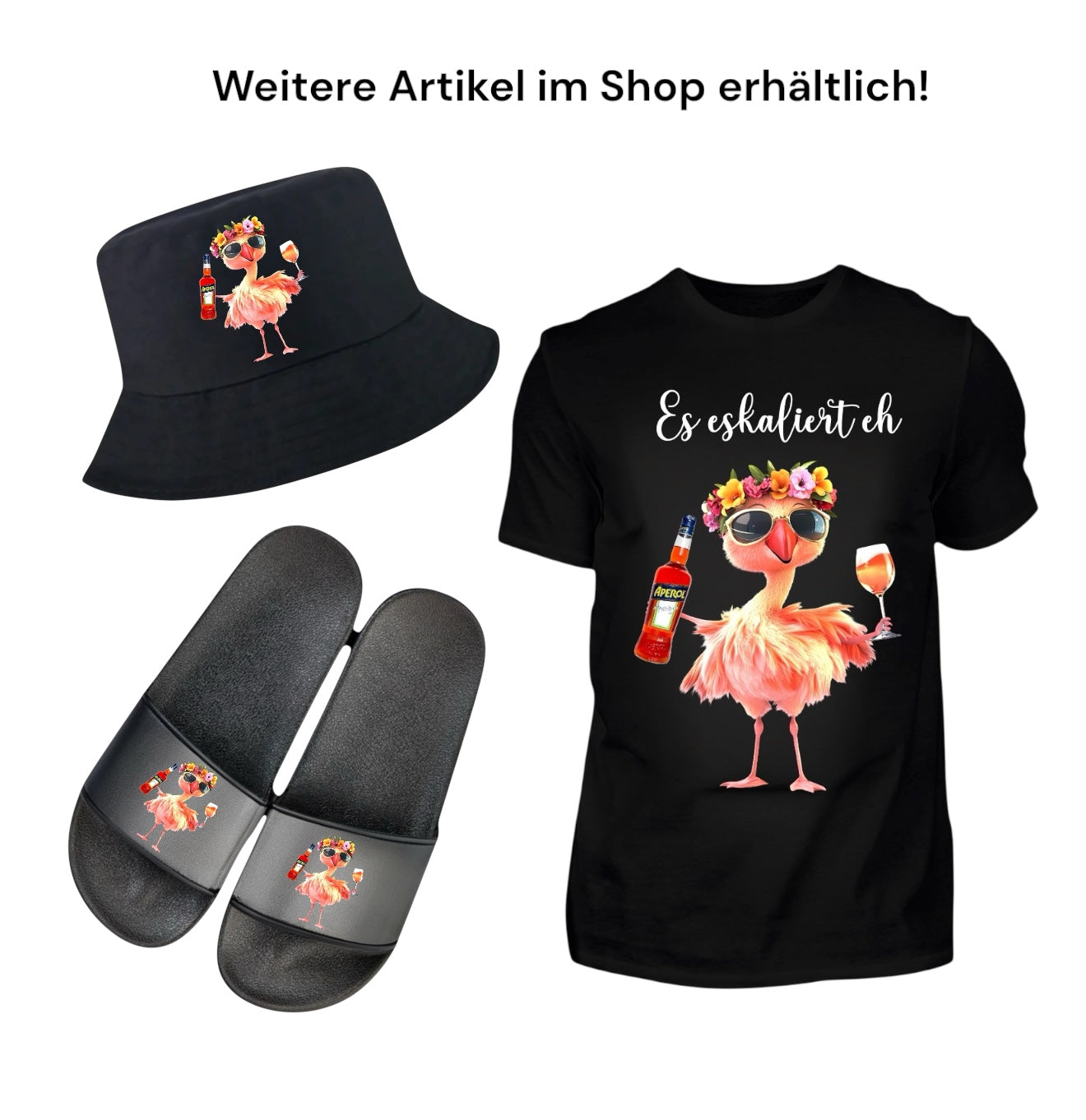 Ein stylischer Flamingo mit Blumenkranz auf dem Kopf, Aperol-Flasche in der einen, ein Glas Spritz in der anderen – dieser Vogel weiß, wie gefeiert wird! Dazu der freche Spruch: „Es eskaliert eh“ – ganz klar das Motto jeder gelungenen Nacht.